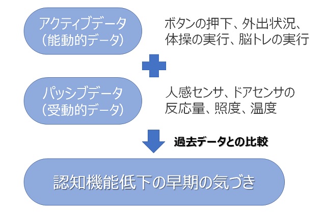 これらの情報を集め、解析し、過去とのデータと比較を行うことで、認知機能低下の早期の気づきの判定要因とします。